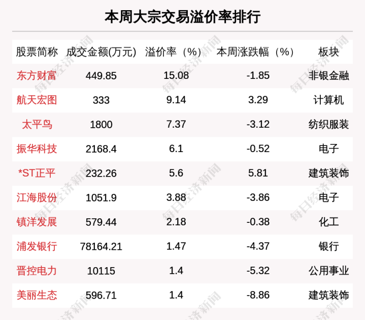 溢价交易方面,本周有1笔大宗交易溢价率超过10%。