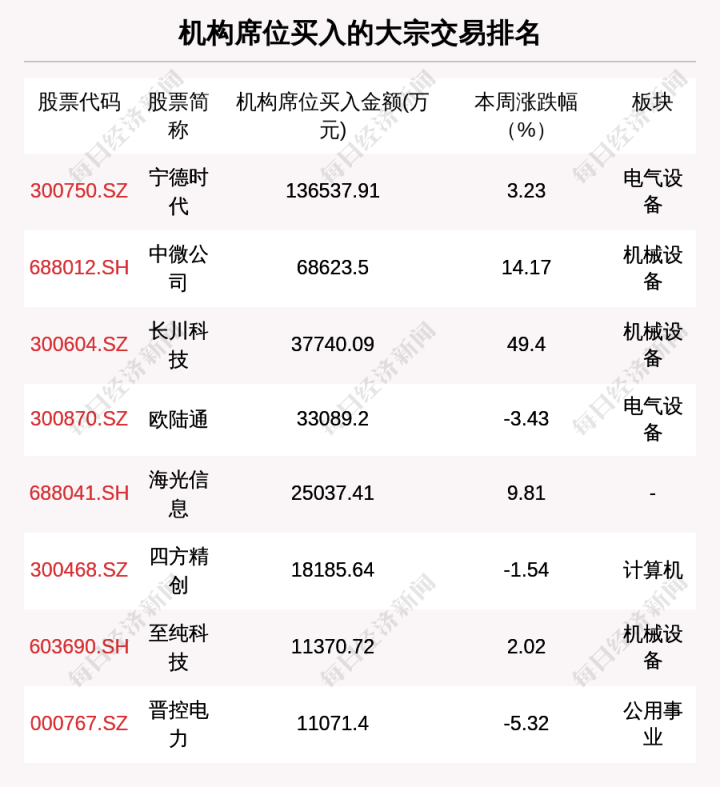 本周大宗交易累计成交金额前3的公司是宁德时代、中微公司、浦发银行,累计成交金额分别为13.7亿元,9.9亿元,7.82亿元。